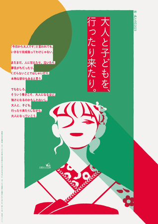 昨年までは『ハタチの心へ』シリーズとして、メッセージグラフィックを展開していましたが、3回目となる今年は、昨年4月に成人年齢が18才に引き下げられたことを考慮し、『ハタチの心へ』シリーズ改め、『祝・成人の日2023』として心からのお祝いの気持ちと、私たちなりのエールを送ります。一生に一度の成人の日を、皆さまが晴れやかで前向きな気持ちで迎えられることを願っております。本グラフィックは、京都きもの友禅公式サイトにて公開いたします。