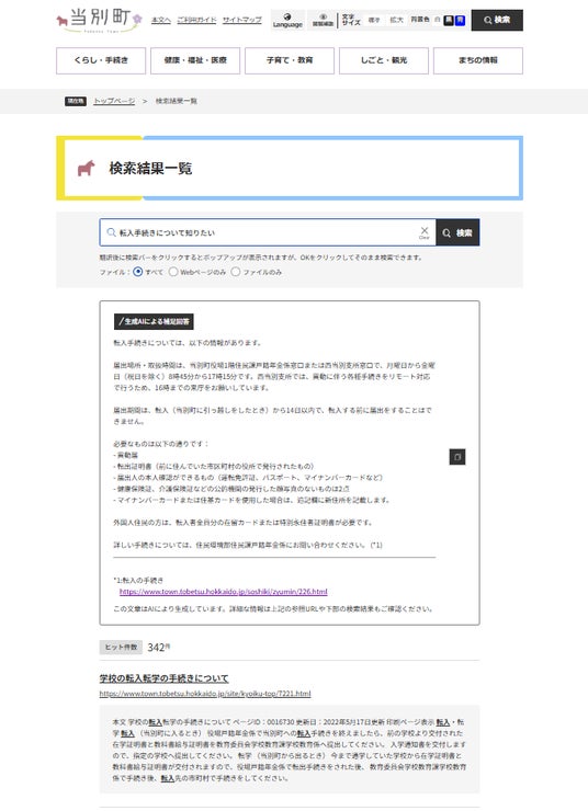 当別町ホームページでのAI検索結果画面
