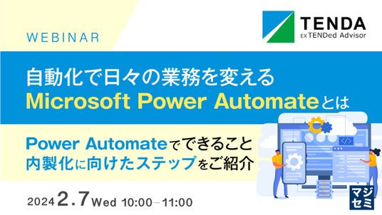 株式会社テンダ(本社/東京都渋谷区、代表取締役会長CEO/小林 謙、以下「テンダ」)は、2月7日(水)に「Microsoft Power Automate活用ウェビナー」を開催いたします。