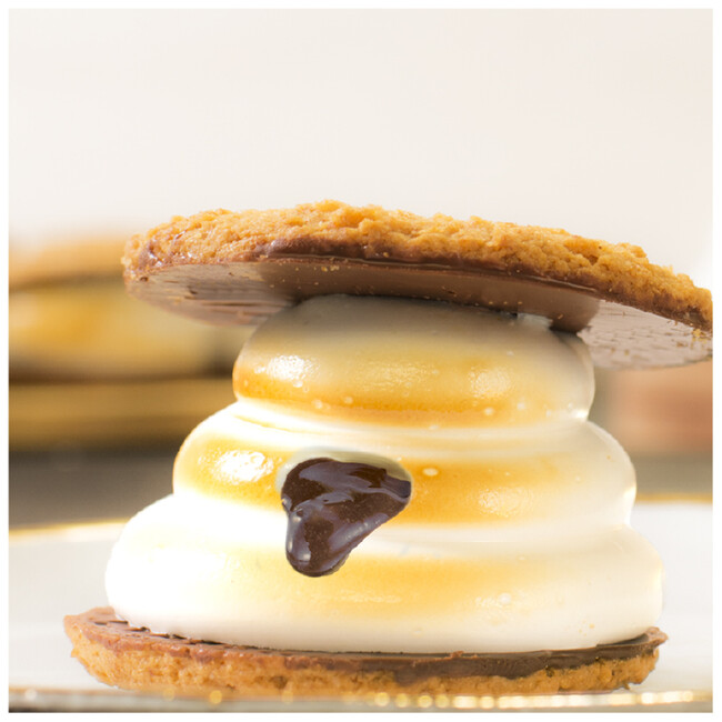 中にとろけるチョコレートを忍ばせたふわふわなマシュマロを丁寧に焼きあげ、片面をチョコレートコーティングしたしっとり香ばしいグラハムクッキーで挟んだ焼マシュマロスイーツです。常温でも温めても冷やしても美味しくいただけます。