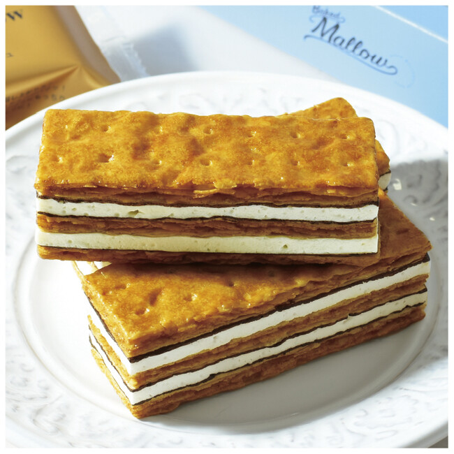 160層に折り重ね焼き上げたバター100%のパイをチョコレートでコーティングし、バターマシュマロと重ね合わせました。パイ×マシュマロの組み合わせと、バター香るマシュマロの濃厚な口どけが楽しいスイーツです。