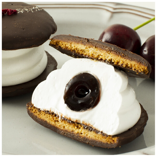 自家製のふわふわマシュマロでイタリア産アマレーナチェリーを丸ごとひと粒包み、チョコレートをフルコーティングした香ばしいグラハムクッキーで挟んだ、女性人気No.1の期間限定商品。美味しさと美しさを追求した至極のマシュマロスイーツです。