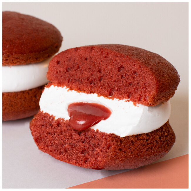 イチゴの濃縮果汁を使用した甘酸っぱいストロベリーガナッシュとふわふわのマシュマロを、アメリカで親しまれている真っ赤なレッドベルベットケーキ※で挟んだマシュマロスイーツです。可愛い”コロン”としたマカロンのような見た目はトレンドに敏感な女性へのギフトにおすすめです。