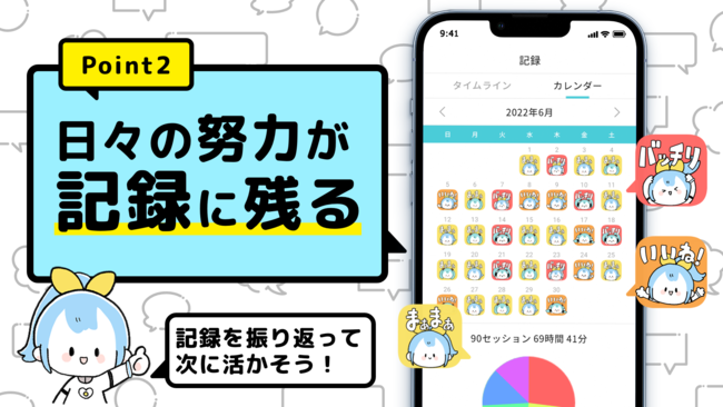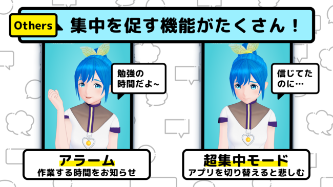 作業する時間になるとお知らせしてくれる「アラーム機能」や、作業中にサボって別のアプリに切り替えるとキャラクターが悲しんでしまう「サボり防止機能」など、可愛さと便利さを両立した機能で日々の作業をサポートします。