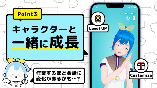 あなたの隣でキャラクターも一緒に作業をします。作業中にはキャラクターとコミュニケーションすることができ、頑張ったら褒めてくれたり、疲れた時は優しく励ましてくれたりと、がんばるあなたを応援します。