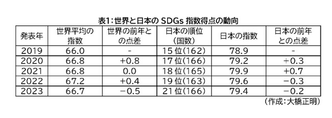 全ての国々、つまり世界のSDGs達成指数の平均とその前年からの変化は、表1にあるように、2020年と2021年は66.8点、2022年は+0.4点と微増したものの、今回発表された2023年は66.7点(前年比-0.5点)となり、2020年以前の状態に後退しました。
