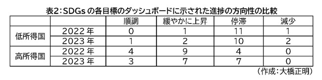 報告書が示した特徴のもうひとつは、表2が示すように、SDGsの進捗の方向性は低所得国では大半が「停滞」か一部は「減少」の傾向が多いのと対照的に、高所得国のそれらは「順調」や「緩やかに上昇」、「停滞」の方向性が多いため、結果として高所得国と低所得国の間でのSDGs進捗状況の格差がさらに拡大したことです。これに伴い、気候変動に関するパリ協定の目標も達成できないことが指摘されています。