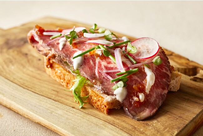 お洒落な見た目でSNSでも大人気のオープンサンドウィッチ。スライスしたカンパーニュの上には、ホテル伝統の製法で作るジューシーなローストビーフをトッピング。味わい、ジューシーさ、柔らかさの全てにおいて何度も食べたくなる逸品。