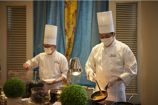今回から、皆さまのテーブルに「のりバター(2月のみ)・オリーブオイル・有塩バター」の3種類をご用意。24時間熟成させたホテルメイドの食パンやローストの風味が香ばしいバゲットなどに付けてお召し上がりください。3月は、「明太バター」が登場。”追い明太”も可能なので、たっぷり付けてお楽しみください。