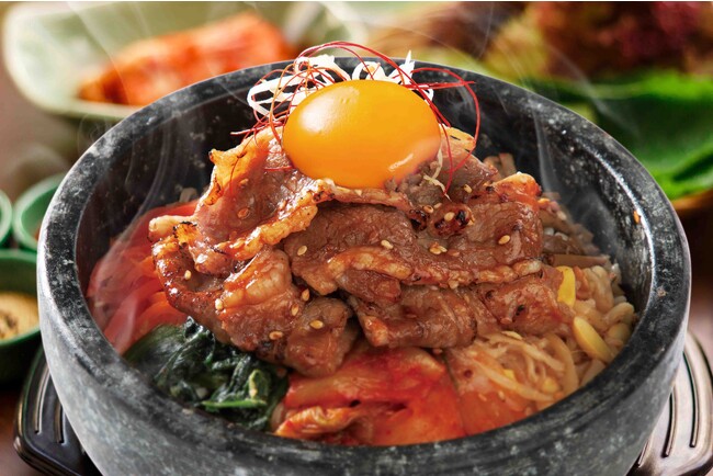 ごはんの上に野菜・キムチ・卵・牛肉・海苔などを乗せ、アツアツを混ぜながら食べる料理です。