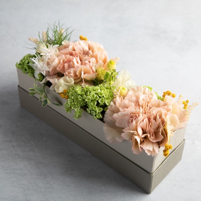 そして、スイーツと同じRESTAURANT DAZZLEの箔押しが施された、高級感のあるBOXの中で輝きを放つのは、ピンクやワインカラーなどコントラストで美しくアレンジした花々。母の日の象徴であるカーネーションを中心に、愛を伝える薔薇などを組み合わせ、優美さと存在感を兼ね備えたデザインに仕上げました。