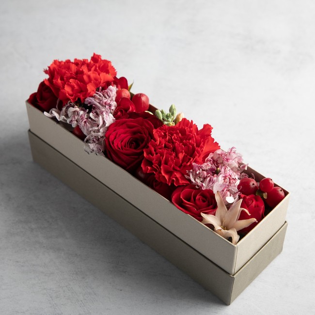一緒に過ごした幸せな時間を思い、情熱的な赤いカーネーションや真紅の薔薇を使ったアレンジメント。