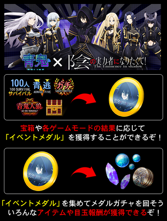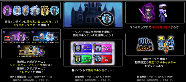 青鬼オンラインに、シド・カゲノーをはじめとしたアニメ『陰の実力者になりたくて!』のキャラクターが青鬼オンラインのコラボスキンとして登場!