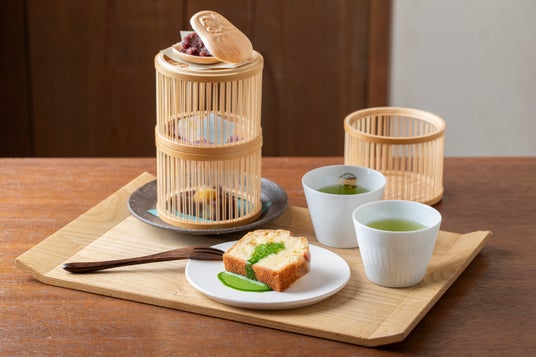 静岡市俵峰産の煎茶は、華やかな香りとゆっくり染み渡る上品な甘みが特徴で、駿河竹千筋細工の籠で美しく飾り付けた、老舗『大黒屋』の和菓子にぴったり。1杯ずつ丁寧に急須で淹れるお茶と共に、見た目も味も贅沢なひとときを。