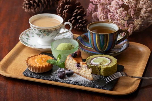 お茶は、一番茶を煎じた香ばしいほうじ茶と、希少品種「ふじみどり」のロイヤルミルクティー。自然豊かな川根本町産の素材で作られた川根ロール、自家農園ブルーベリーチーズケーキなど5種のドルチェとも相性抜群です。