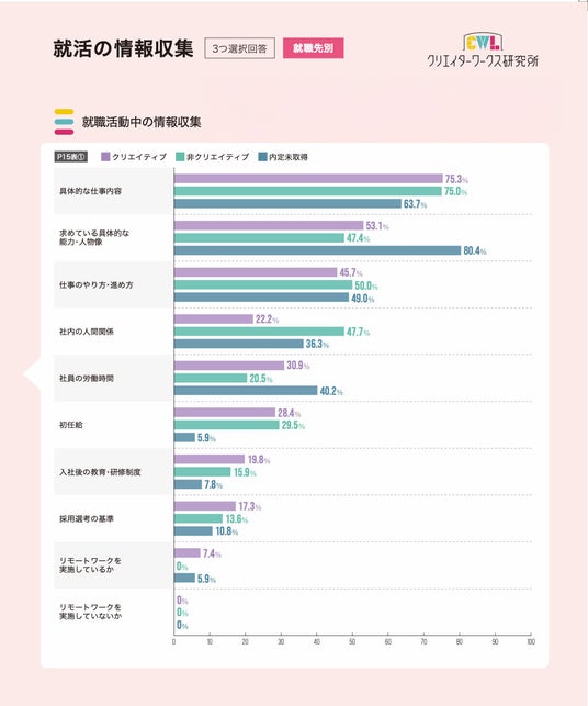 学生が情報収集で最も見ていたのは、昨年から13.4ポイント減少したものの「具体的な仕事内容」となりました。