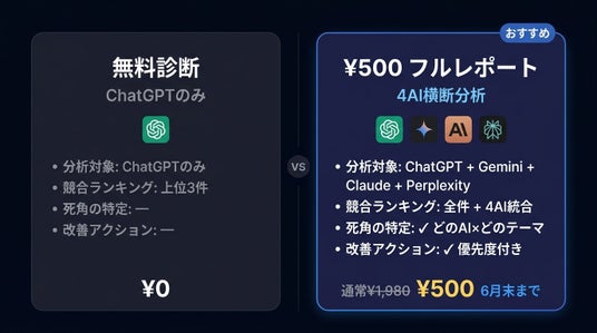 - フルレポート:4AI横断診断 通常¥1,980 → キャンペーン¥500(6月末まで)