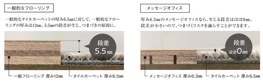 「メッセージオフィス」は、厚み6.3mmの薄型設計により、一般的なタイルカーペット(約6.5mm)と同等の厚みを実現。 OAフロア下地に施工した際も、フローリングとカーペットの境界で段差が生じにくく、つまずきリスクの低減につながります。 また、500mm角のOAフロアに対応した幅寸法設計により、OAフロアのジョイントと床材の継ぎ目が重なりにくく、浮きや 段差が発生しにくい納まりを実現しています。