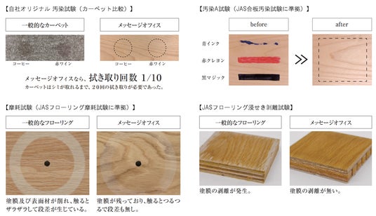 「メッセージオフィス」は、土足使用が前提となるオフィス環境を想定し、摩耗・水分・汚れに強い塗装仕様を採用しています。 カーペットでは落としにくいコーヒーやインクなどの汚れも拭き取りやすく、日常清掃の負担を軽減。 また、キャスター付き椅子や家具の使用にも配慮し、摩耗による劣化が起こりにくい設計としています。