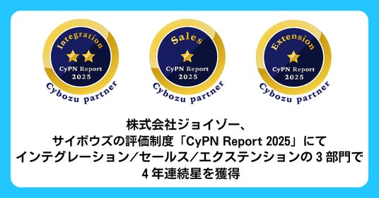 株式会社ジョイゾー(本社:東京都江東区、代表取締役社長:四宮 靖隆、以下、ジョイゾー)は、サイボウズ株式会社(本社:東京都中央区、社長:青野 慶久、以下サイボウズ)のオフィシャルパートナー評価制度である「Cybozu Partner Network Report 2025」(以下「CyPN Report 2025」)において、インテグレーション/セールス/エクステンションの3部門で4年連続で星の評価を獲得したことをお知らせいたします。