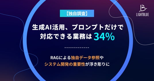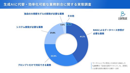 最先端アルゴリズムの社会実装に取り組むAIスタートアップ、株式会社Lightblue(代表取締役:園田亜斗夢、本社:東京都千代田区、以下「Lightblue」)は、生成AIを導入済み、または導入を半年以内に予定している法人を対象に、生成AIワークショップを開催し、その活用方法を模索してまいりました。ワークショップに参加した36社から抽出した1,281件の「生成AI活用アイディア」を、具現化に必要な技術の観点から集計・分析した結果、生成AIのプロンプトだけで解決できる施策は約34%にとどまり、RAGによる独自データ参照やシステム開発の重要性が浮き彫りとなりました。
