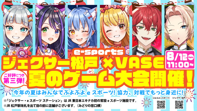 株式会社Art Stone Entertainment(本社:千葉県松戸市 代表取締役:板倉節子)が運営するVTuber / バーチャルライバーグループ「VASE(ヴェイス)」が、ジェクサーeスポーツステーションJR松戸駅店とコラボイベントを2023年8月12日(土)に開催することをお知らせいたします。
