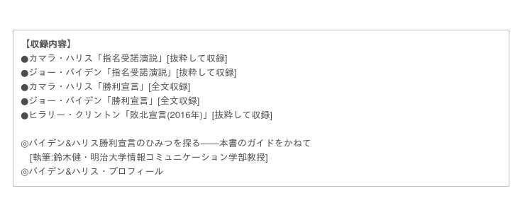 今回の選挙によって分断がさらに広がり、明るみに出ているアメリカにおいて、彼らはどんな言葉を吐き、どんな一歩を踏み出そうとしているのか?各演説の英日完全対訳、詳しい注釈、生の音声、さらに鈴木健氏(明治大学情報コミュニケーション学部教授)のレトリック解説から核心に迫る完全保存版となっています。様々な情報が飛び交っている今だからこそ、本書で彼らの生の声に耳を澄ましてみてください。