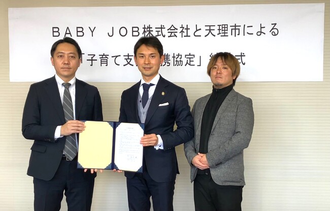 (12月21日、天理市役所にて子育て支援連携協定を締結。左から BABY JOB営業部部長 福森章太郎、天理市長 並河健氏、天理市議会 文教厚生副委員長 西崎圭介氏)