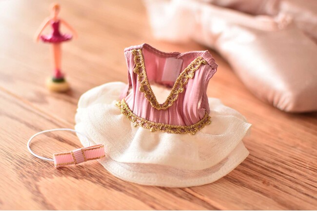 コスチュームはバレエの演目にほぼ必ず登場するピンクのチュチュと頭飾りをセレクトしました。演目に関係なく発表会や誕生日などに贈やすい、長く喜ばれるギフトです。バレエをよく知る社員とコスチュームデザイナーが協力して作ったこだわりのデザインです。