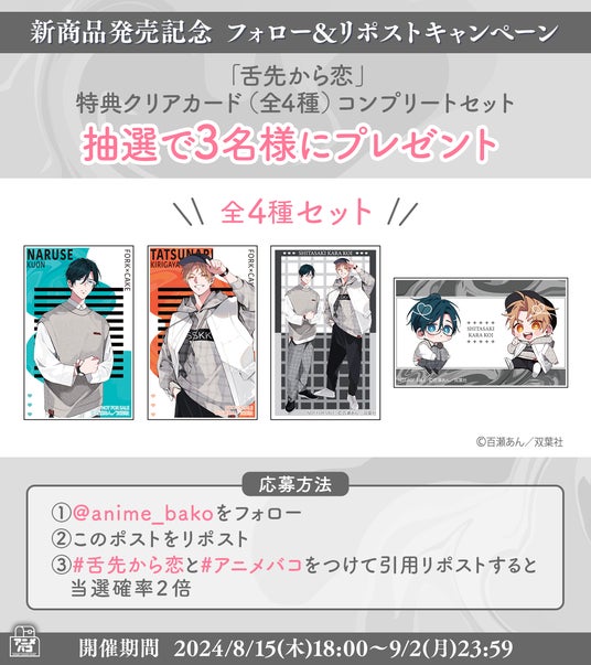 株式会社coly(本社:東京都港区赤坂、代表取締役:中島 杏奈)が運営する「アニメバコ」(https://www.animebako.com/)は、株式会社双葉社(本社:東京都新宿区、代表取締役社長:戸塚 源久)の人気漫画『舌先から恋』(著:百瀬あん)の描きおろしイラストを使用した商品の販売や、各種キャンペーンを実施することをお知らせいたします。