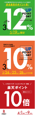 12th Anniversary「春うららいず」の開催期間中、二子玉川ライズ S.C.でのお買い物がおトクに楽しめる3つのポイントアップキャンペーンを実施します。