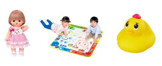 当社では、温度の変化で色が変わるインキ「メタモインキ」を応用し、未就学児童向けの知育玩具をはじめとする様々な玩具の企画開発を行っております。主な商品に「スイスイおえかき」シリーズ、抱き人形「メルちゃん」シリーズがあります。いずれもロングセラー商品で「スイスイおえかき」は発売26年目、「メルちゃん」は発売34年目を迎えました。今年で25年目を迎えた「アヒル隊長」なども含め、これからも玩具を通じ、子供たちに感受性と創造性をのばす「夢と小さな驚き」を提供し続けます。