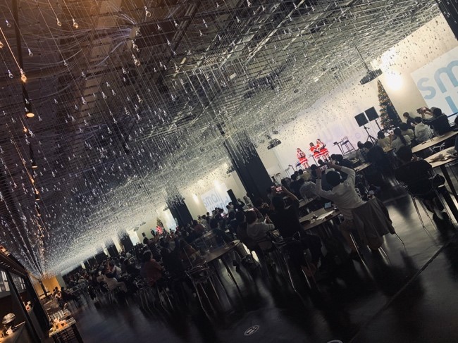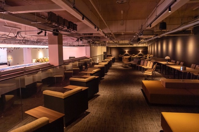 スモワル2階には約300席あるレストランがあります。前方には13.5m×4.6mの舞台とライブ配信設備を備えており、食事をするだけではなくショーやイベントなどとしても利用可能です。レストラン部分を鏡張りにすることもできるため、様々なシーンに適応できます。