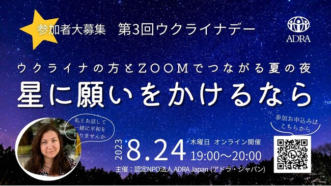 認定NPO法人ADRA Japan (アドラ・ジャパン、 所在地:東京都渋谷区神宮前1-11-1 理事長:柴田俊生)は、第3回ウクライナデーウクライナの方とZOOMでつながる夏の夜「星に願いをかけるなら」をウクライナ危機から約1年半となる2023年8月24日(19時開始)に開催いたします。