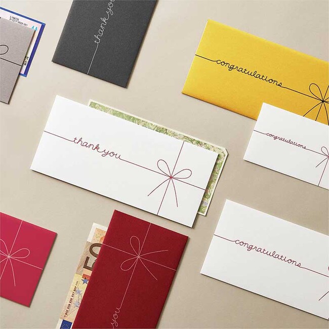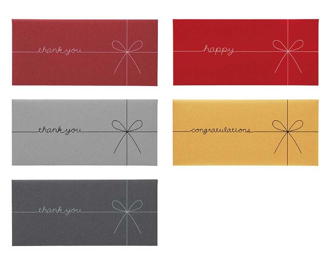 今回のリニューアルでは、「thank you R(レッド)」「happy R(レッド)」「congratulations G(ゴールド)」の3種を、従来品から紙質や印刷加工を見直し、より上品な雰囲気に仕上げました。さらに「thank you LG(ライトグレー)」と「thank you DG(ダークグレー)」の新色2種を数量限定で発売します。モノトーンでシンプルかつ洗練されたデザインのため、ユニセックスに使えます。