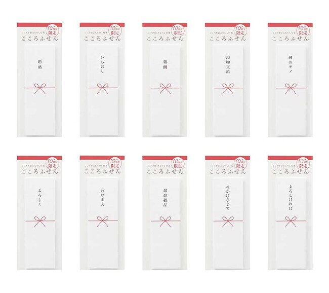 今回新発売する『こころふせん 10周年限定商品』は、表書きに「賄賂」や「報酬」、「例のモノ」などのユニークな言葉を採用した全10種です。『こころふせん』にさらに遊び心をプラスし、より幅広いシーンでコミュニケーションを楽しめます。