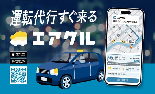エアクルは、運転代行業界の課題解決を目的として2020年8月にリリースした、運転代行配車プラットフォームです。利用者がスマートフォンから配車依頼を行うと、位置情報を活用した効率的なアルゴリズムが最適な運転代行業者とマッチングします。配車確定にかかる時間は平均13秒、平均到着時間はわずか7分と、従来の電話注文と比較して約80%以上の時間短縮を実現しています。