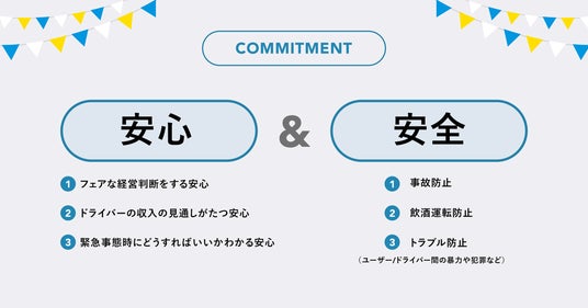 移動インフラを設計するにあたり、全てのドライバーとお客様に安心・安全を約束することをここに宣言いたします。収益の見通しと透明性ある経営判断による「安心」、事故・飲酒運転・トラブルの防止による「安全」。この2つを担保することで、全ての皆様に安心・安全に参加できるプラットフォームを目指します。