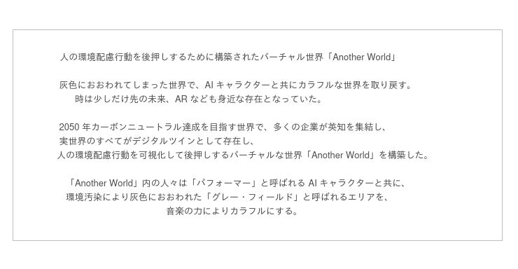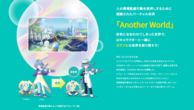 現実世界とリンクしてゲーム上の世界で再現したデジタルツインのミラーワールドを舞台に、現実世界で環境配慮行動を行うことで、灰色に覆われた世界を他のユーザーと協力しながら浄化して色を取り戻すゲームです。