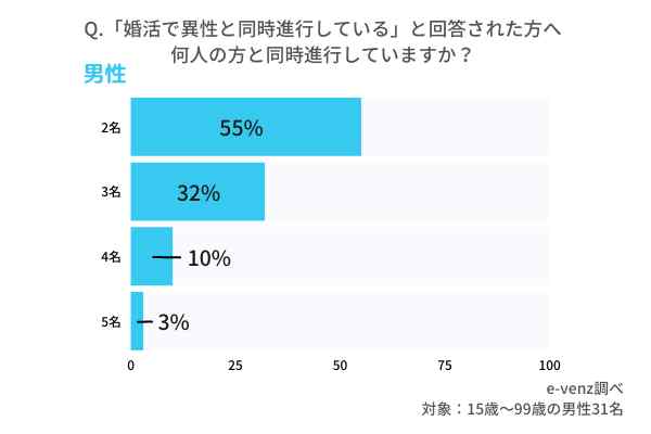 では次に「婚活で異性と同時進行している」と回答された方へ、何人の方と同時進行しているのか調査してみました。