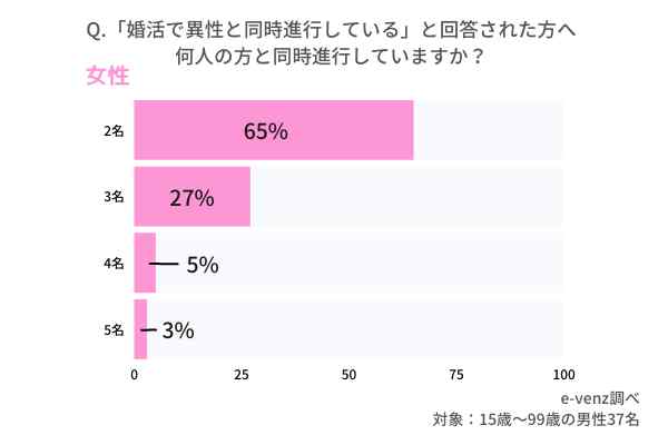 男性女性共に2名と回答した人が6割程度でした。同時進行の人数が増えすぎても、やりとりが逆に雑になってしまったり、情報がごちゃごちゃになってしまったりすることもあるので、注意が必要です。
