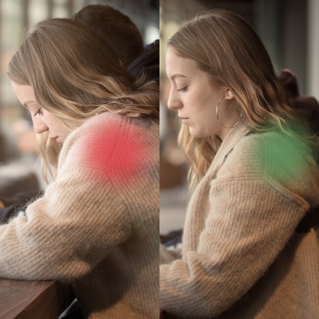巻き肩の女性も、肩が自然と後ろに引っ張られるため胸が前に出て胸から腰のS字ラインも理想的な角度に。