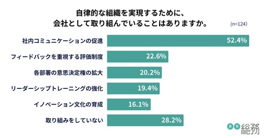 自律的な組織を実現するために会社として取り組んでいることについて尋ねたところ、「社内コミュニケーションの促進」が52.4%で最も多く、次いで「フィードバックを重視する評価制度」が22.6%、「各部署の意思決定権の拡大」が20.2%となりました。一方、「取り組みをしていない」と回答した企業は28.2%に上りました(n=124)。