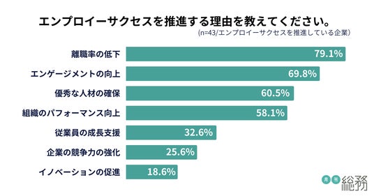 エンプロイーサクセスを推進する理由を尋ねたところ、「離職率の低下」が79.1%で最も多く、次いで「エンゲージメントの向上」が69.8%、「優秀な人材の確保」が60.5%となりました(n=43/エンプロイーサクセスを推進している企業)。