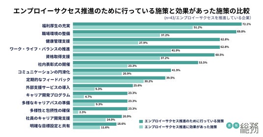 また、実際に効果があった施策を尋ねたところ、「福利厚生の充実」が51.2%で最も多く、次いで「ワーク・ライフ・バランスの推進」が41.9%、「職場環境の整備」と「資格取得支援」がともに37.2%となりました(n=43/エンプロイーサクセスを推進している企業)。
