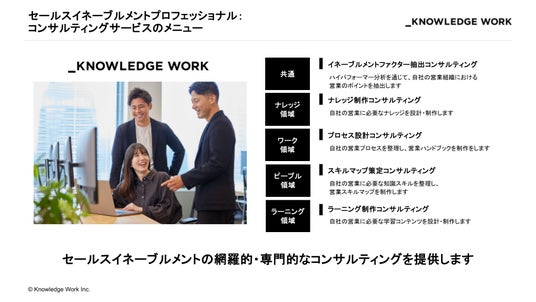 長らくセールスイネーブルメントに関わってきましたが、セールスイネーブルメントは米国などで実績を上げている強力な営業支援メソッドであるにも関わらず、国内の多くの企業でそのノウハウが不足しており、営業組織で実践することができていません。ナレッジワークのコンサルティングサービスは、各社に合ったイネーブルメントの仕組みづくりを伴走してご支援することが可能です。これまで国内、グローバルを通じて培った専門知見を元に、お客様の変革をパートナーとしてご支援できればと考えております。