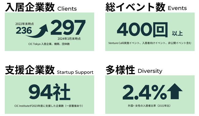 CIC Tokyoはオープンから3年を迎え、入居者は290社以上、年間で開催されるイベントはVenture Cafeの実施するThursday Gatheringや入居者向けのイベントも含めて400回以上となるなど、イノベーションハブとして飛躍的に成長を見せました。また、2023年に新たに発足したCIC Instituteは、94社以上のスタートアップの海外展開や成長を後押しするなど、成功例を多く含む好スタートを切りました。