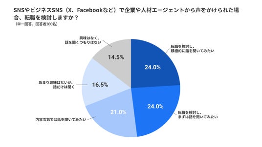 SNSで企業や人材エージェントから声をかけられた場合の反応について聞いたところ、「転職を検討し、積極的に話を聞いてみたい」と「転職を検討し、まずは話を聞いてみたい」がそれぞれ24.0%、「内容次第では話を聞いてみたい」が21.0%となり、合計で69.0%が前向きに検討する姿勢を持っていることがわかりました。