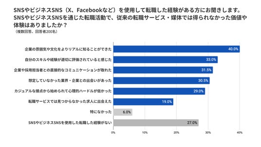 SNS転職経験者の最多回答は「企業の雰囲気や文化をリアルに知れた(40.0%)」、求人票では伝わらない"企業らしさ"に価値