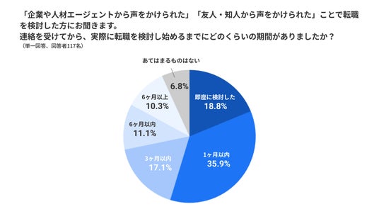 「企業や人材エージェントから声をかけられた」「友人・知人から声をかけられた」ことで転職を検討した人に、連絡を受けてから転職を検討し始めるまでの期間を聞いたところ、「即座に検討した(18.8%)」と「1ヶ月以内(35.9%)」が、合わせて54.7%と比較的短期間で転職を検討し始めていることがわかりました。